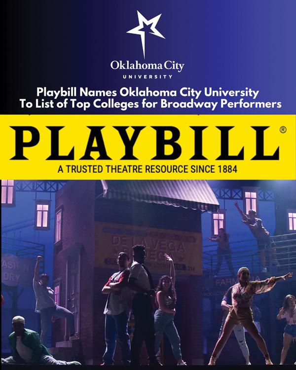 OCU was named to Playbill's 2024-25 list of Top Colleges and Universities for Broadway performers! Bravi tutti to our stars featured on Broadway between April 29, 2024 and April 27, 2025: Rebekah Bruce in Dead Outlaw, Ty Fanning in Othello, Jacob Gutierrez in Aladdin, Wes Hart in Aladdin, Sasha Hutchings in Gypsy, Vance Klassen in The Book of Mormon, Colby Q. Lindeman in Wicked, Elliott Mattox in Tammy Faye, Alicia Newcom in Wicked, Jessie Peltier in Back To The Future, Katie Pohlman in Aladdin, Leah Read in The Heart of Rock and Roll, Benjamin Rivera in Aladdin, and Moulin Rouge! The Musical, Clifton Samuels in Elf, Jennifer S叩nchez in Real Women Have Curves and Elf, Rodney Thompson in Elf, Darius Wright in Once Upon a Mattress and Back To The Future, and Richard Riaz Yoder in Once Upon a Mattress.